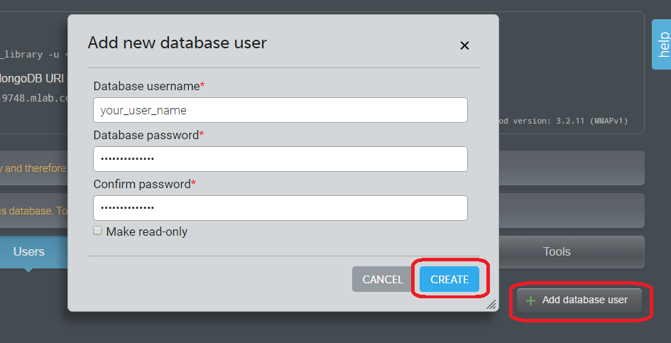輸入用戶名和密碼(兩次),然後按創建Create。不要選擇只讀read-only。